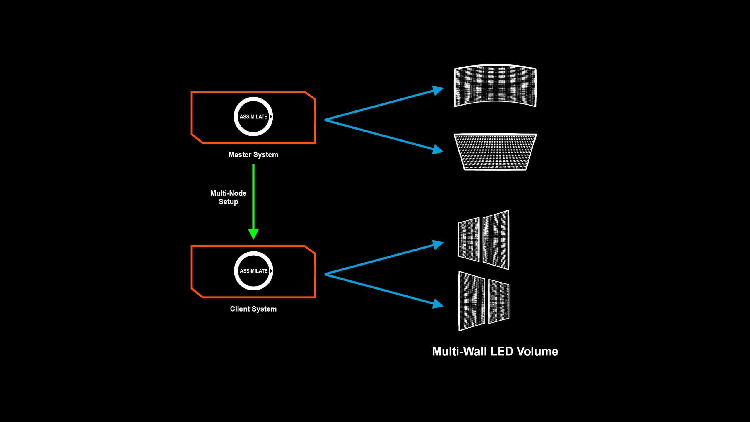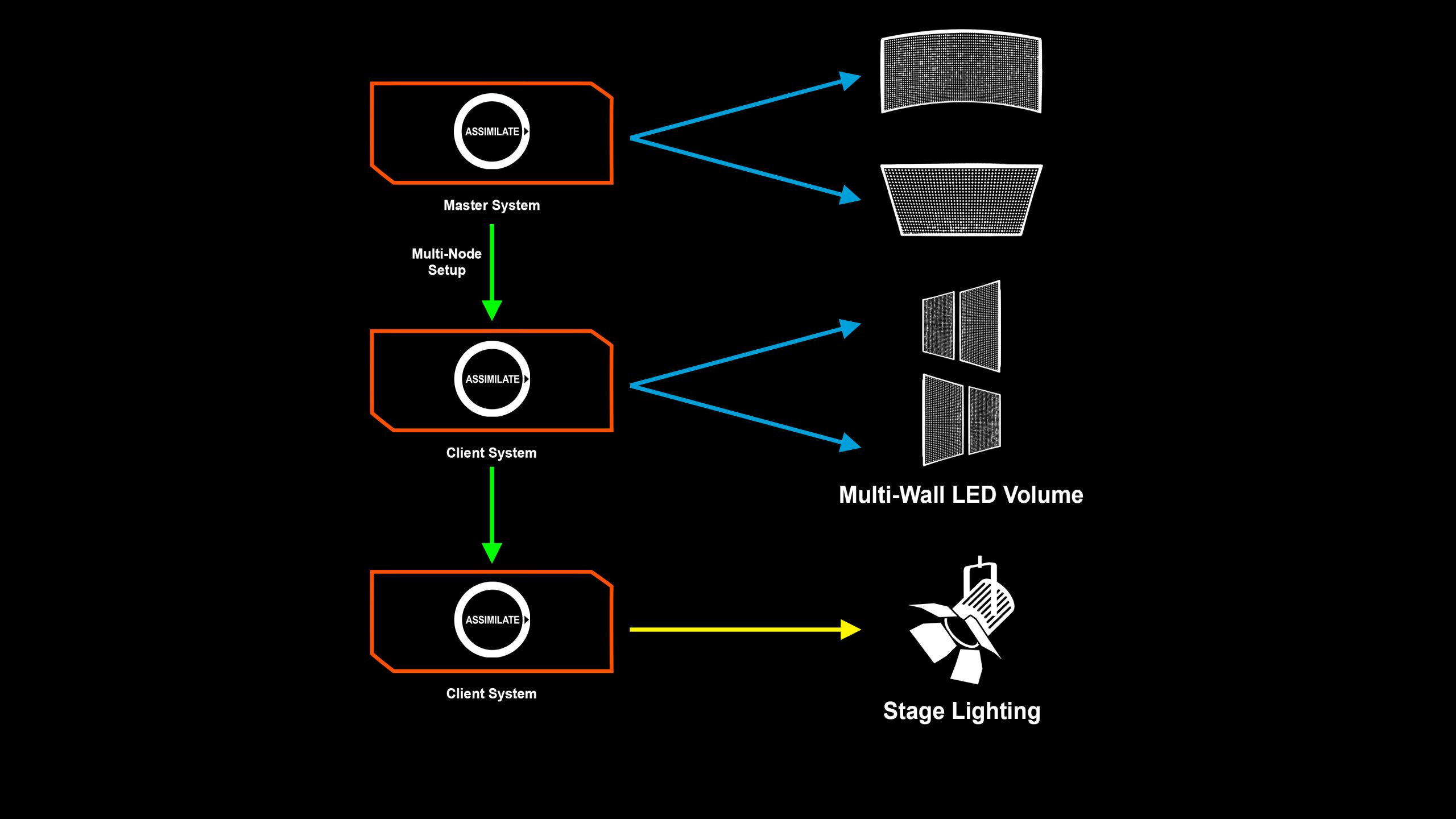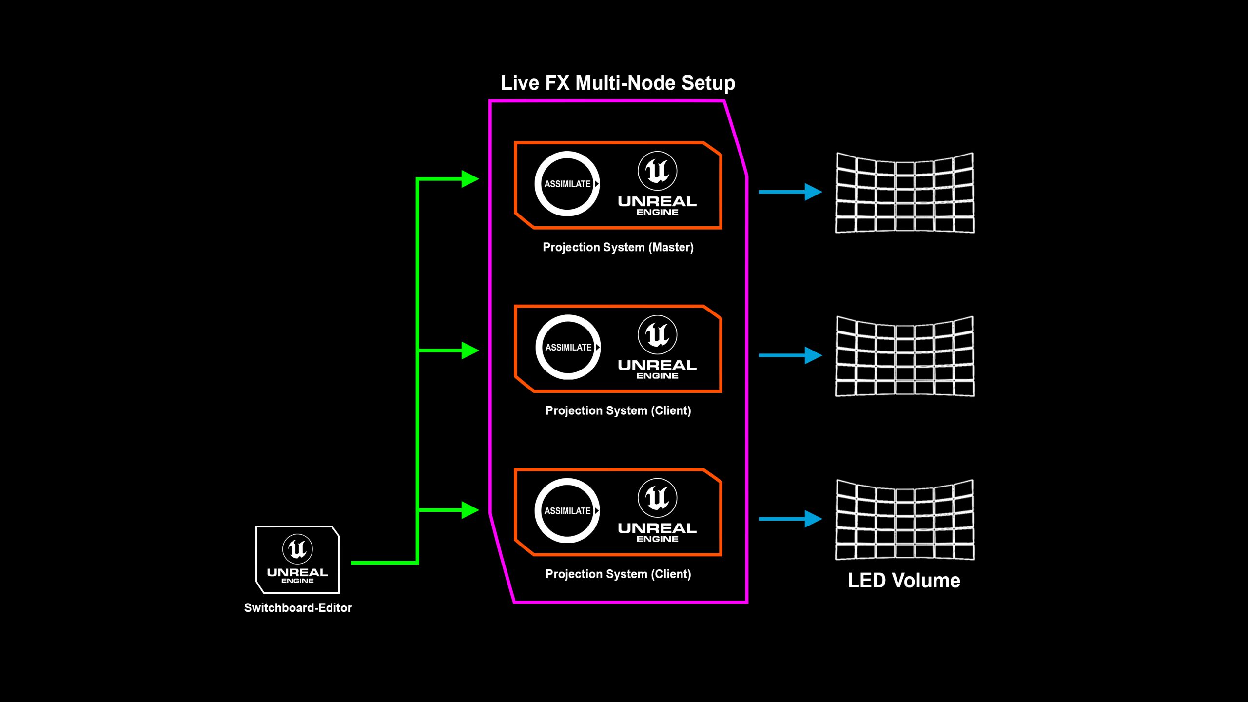 Even with smaller stages, it can make sense to run a multi-node workflow for the simple matter of distributing job roles. This way, the lighting technician can connect to the projection system from a separate Live FX workstation to drive stage lighting in sync with the projection on the LED volume.